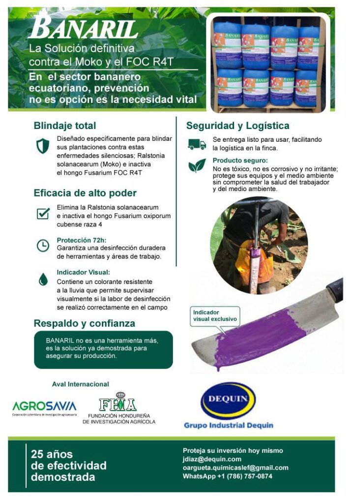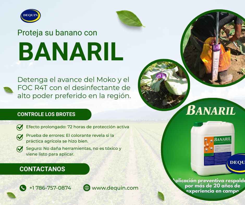 BANARIL es un producto que ha mostrado su eficacia por más de 20 años diseñado para desinfectar equipos que son utilizados de corte y deshije, sirve para el control de Moko y Fasarium. Se utiliza en plantas empacadoras de banano, en los equipos de la áreas de corte y para combatir la bacteria Ralstonia Solanacearum agente causal del Moko del banando, en la limpieza de las fincas.